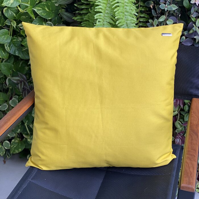 Almofada 50cm x 50cm sem aba com tecido 100% acrílico amarelo. Enchimento com fibra cardada antimofo e ácaros, revestida com tecido impermeável. Ziper inoxidável na parte inferior.